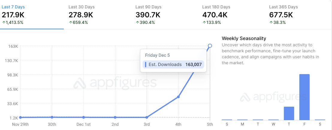 Appfigures estimates ~200k downloads over Thursday and Friday after it was announced.