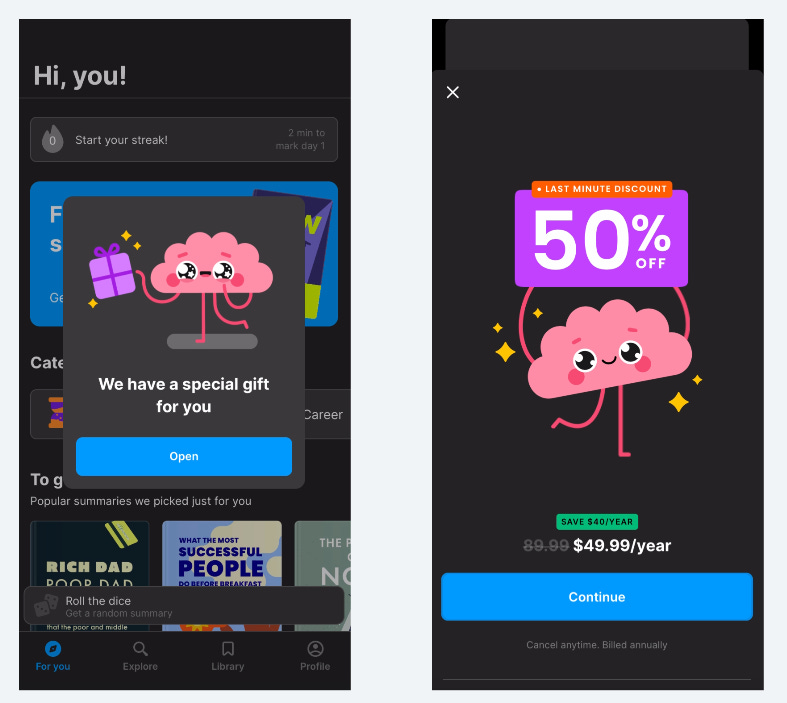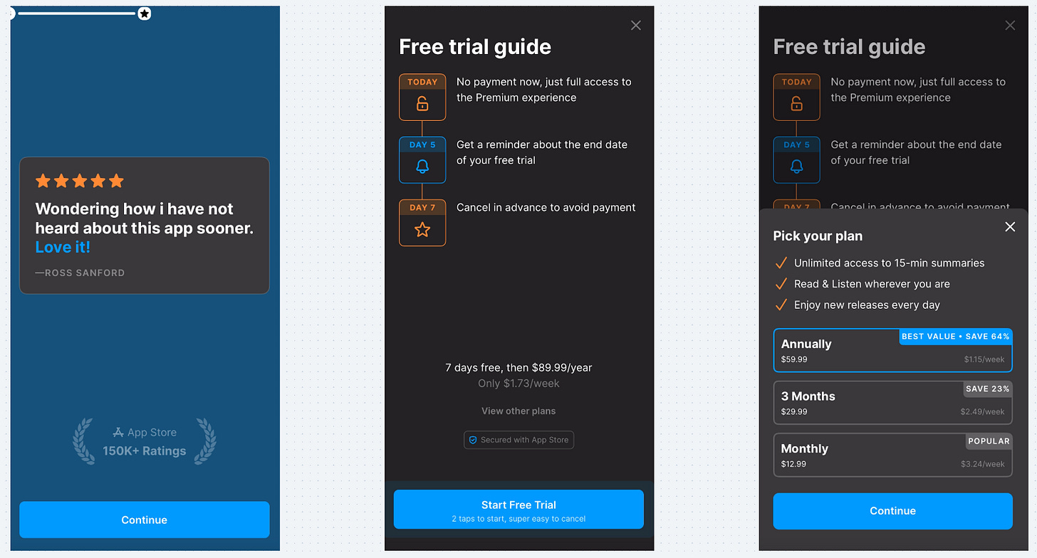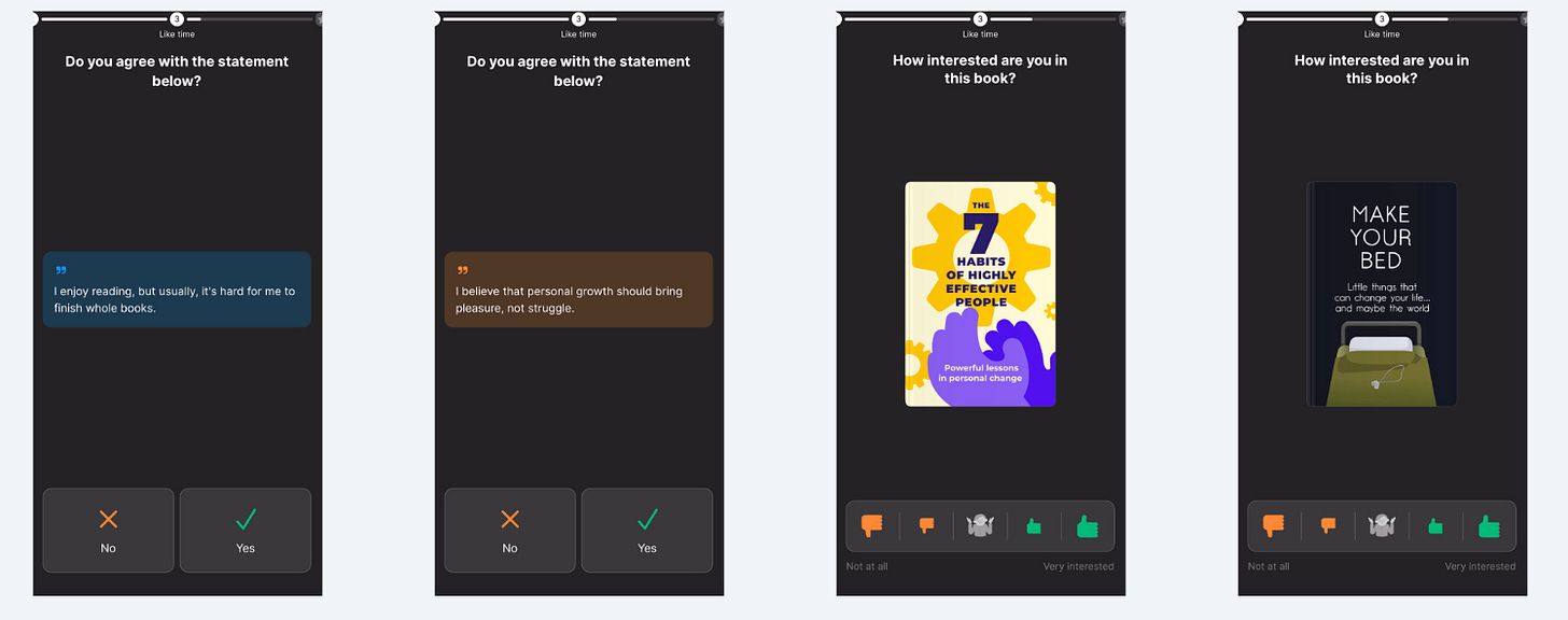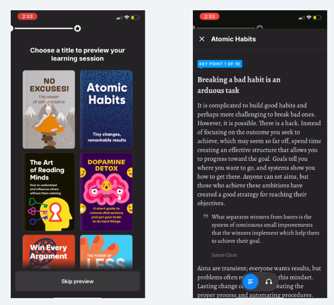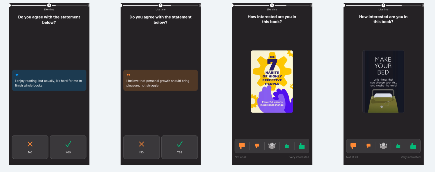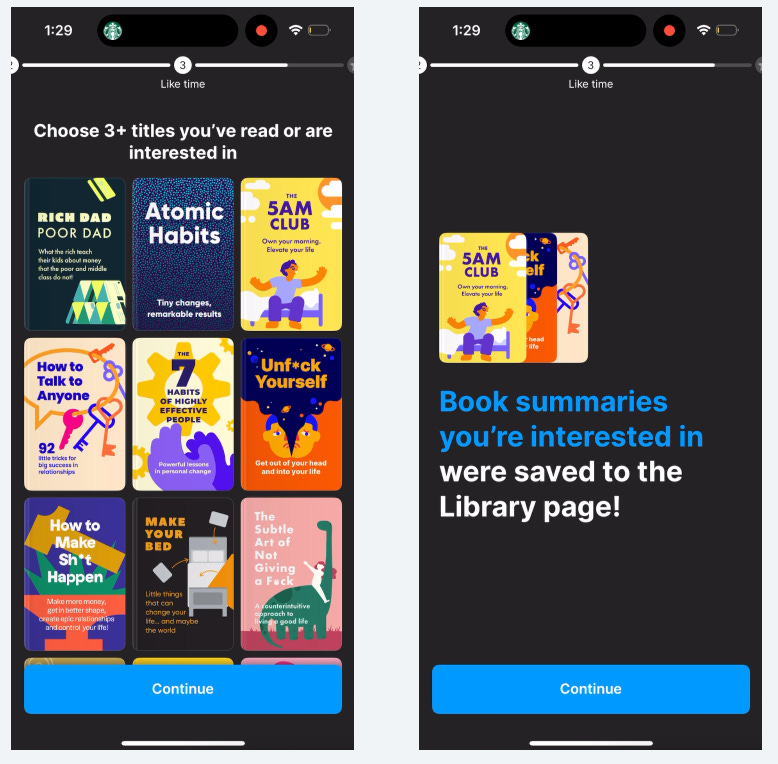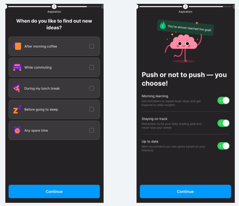 (^ Not shown: “Do you know what a book summary is?” screen before these two. They do eventually remove this.)