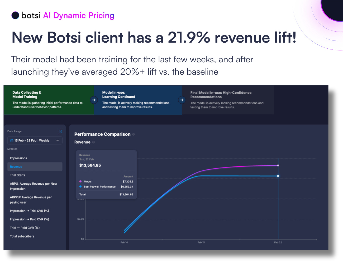 Botsi builds and trains custom AI/ML models on your app and your paywalls, to figure out the right offer to maximize LTV for each user.