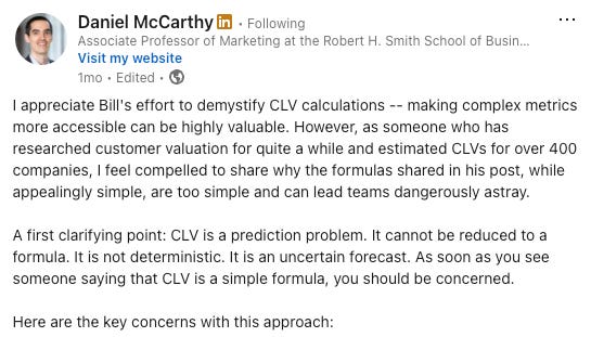 While we’re in data analysis world, go read this LinkedIn post from Daniel McCarty on why customer lifetime value is hard (he is a really good follow):