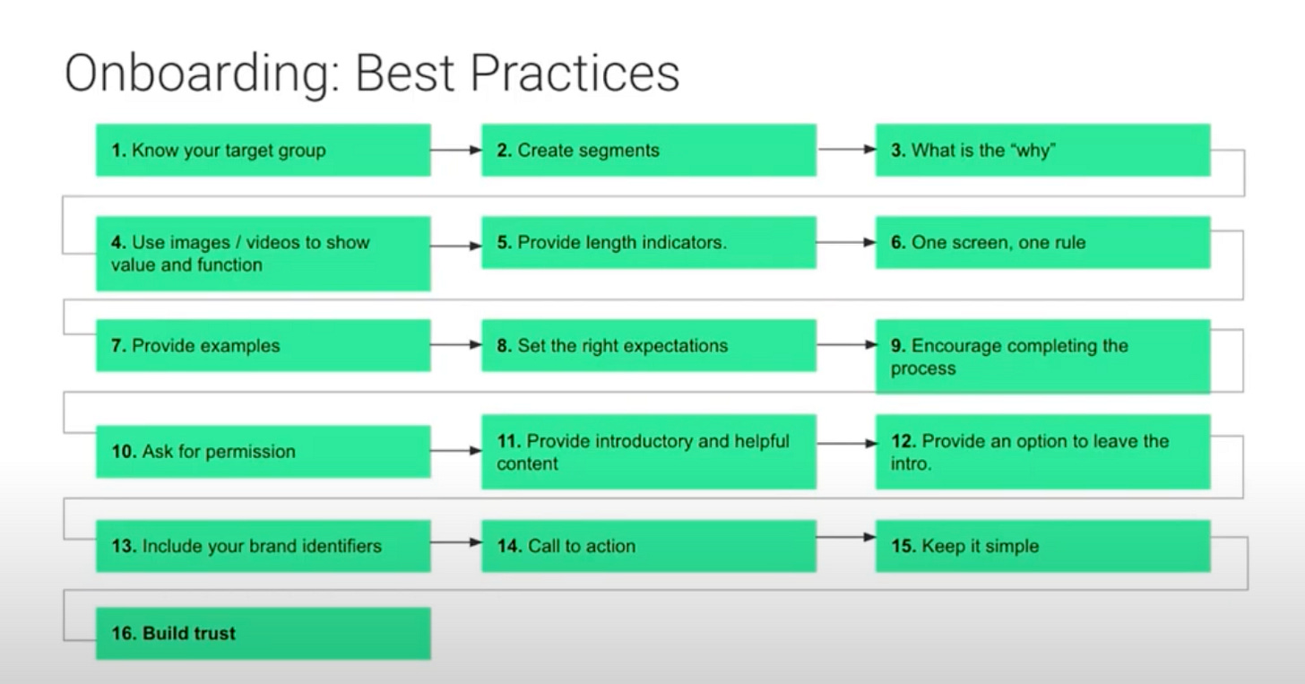 Watch the full presentation here. The presentation is titled "mobile app onboarding" but I believe these are valuable tips for any type of product.