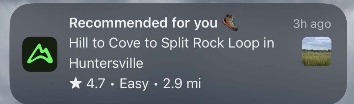 AllTrails recommendation notification is programmatic and personalized to my location.