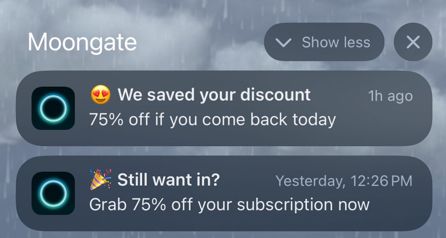Moongate sends a notification pretty immediately after you close the app as a new user and offers you a discount.