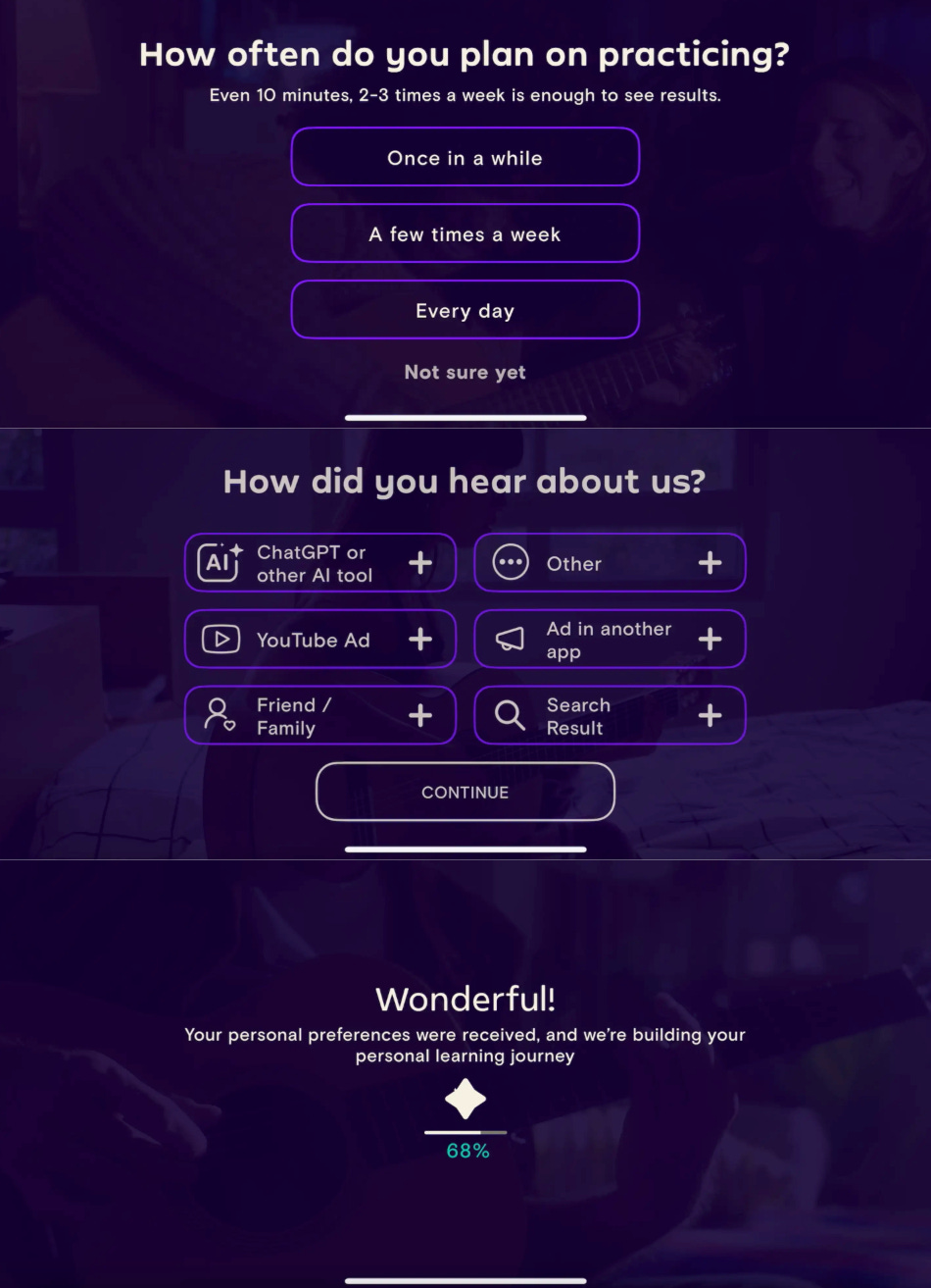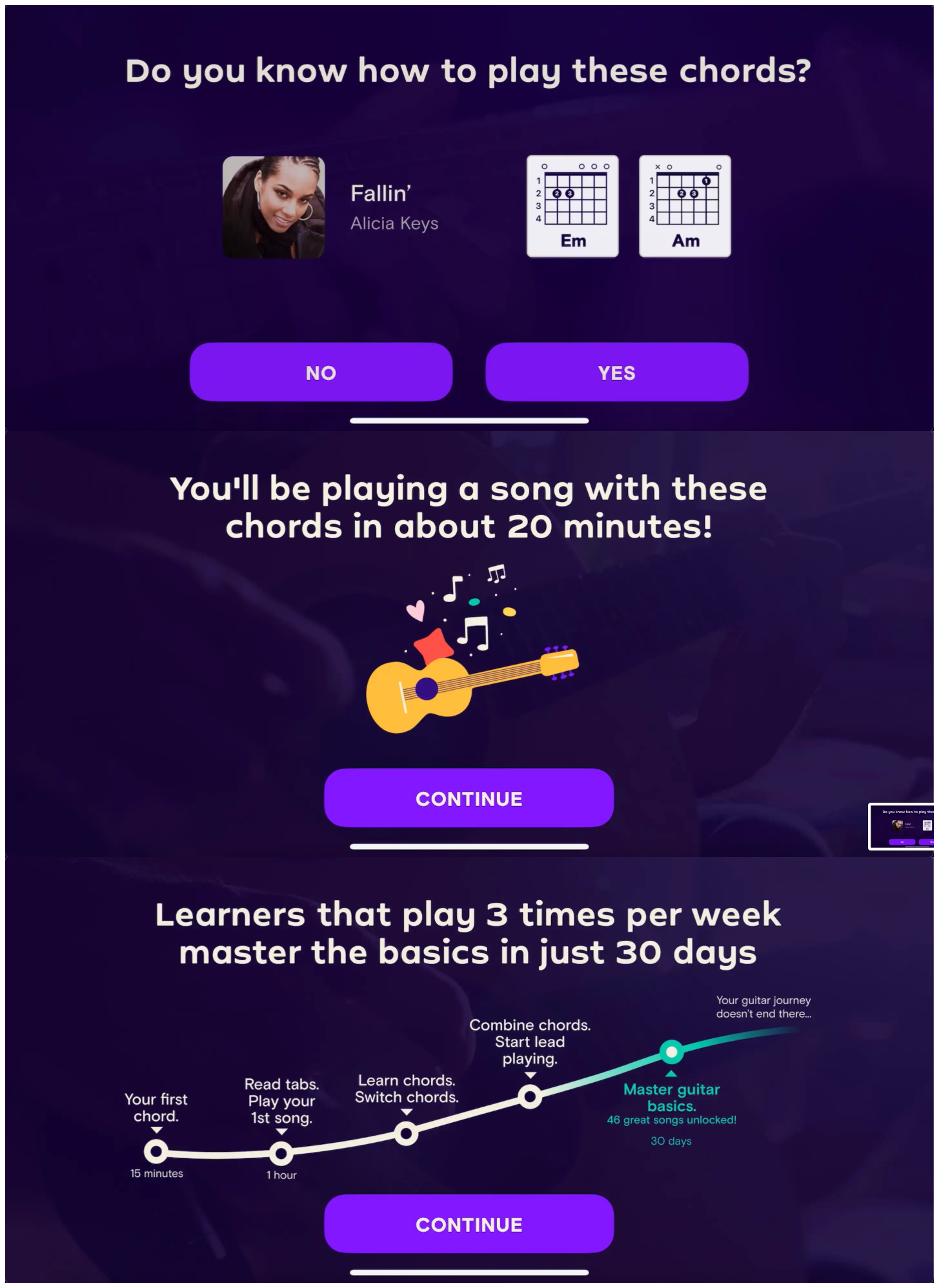 They don’t have a 50 screen onboarding flow, they have a few questions, and then get you into the first lesson.