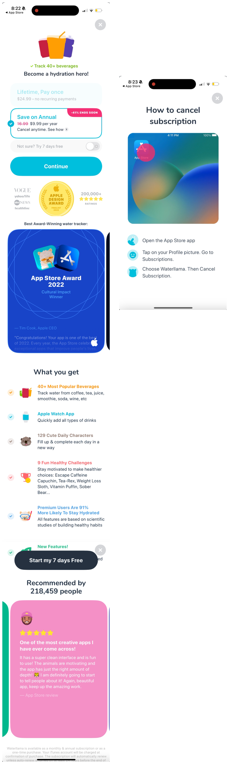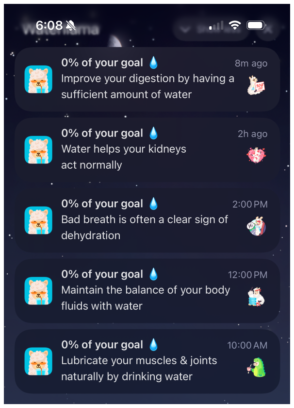 Last piece I really enjoyed from Waterllama: their push notifications each had a different real benefit of drinking water and actually felt pretty motivating.
